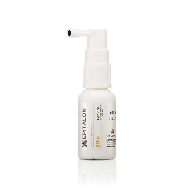 The dietary supplement EPITALON® spray is a synthetic bioregulator made of four amino acids: alanine, glutamic acid, aspartic acid, and glycine. It was developed by Khavinson, a professor and gerontologist, whose research focused on the development of peptide supplements used to restore function in various organs in order to prevent and reverse the aging process.