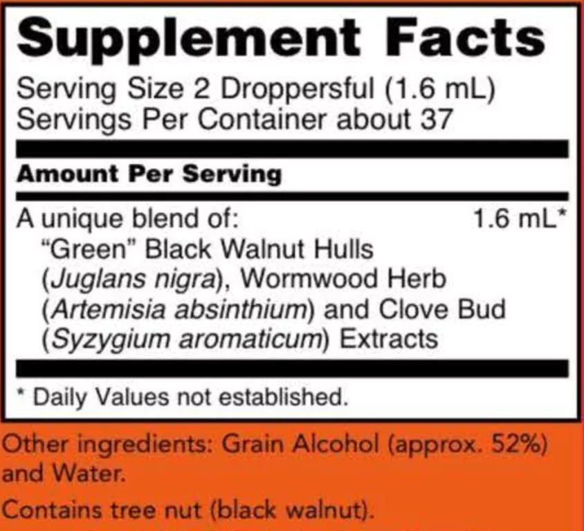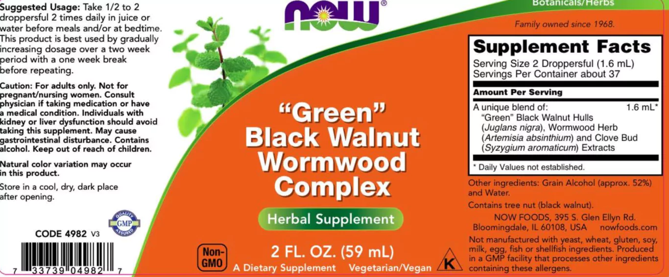 NOW® “Green” Black Walnut Wormwood Complex is an herbal formulation that combines three traditional herbal extracts in one convenient liquid supplement. This product is manufactured with extracts of unripe (green) black walnut hulls (Juglans nigra), wormwood (Artemisia absinthium) and clove buds (Syzgium aromaticum).