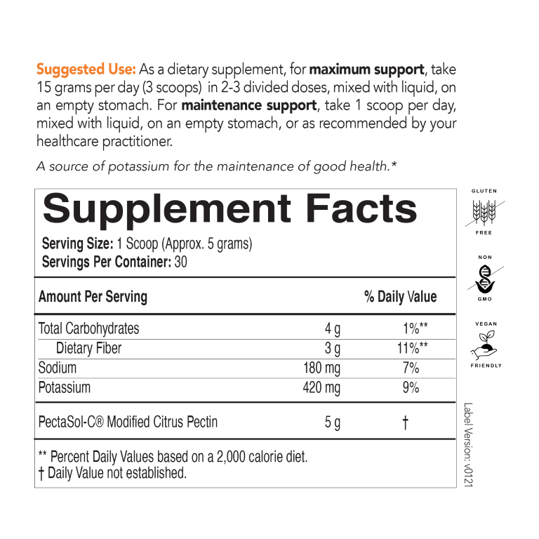 This natural product is derived from the pith of citrus fruit peels, including lemons, limes, oranges and grapefruits, and is modified using a proprietary enzymatic and pH process. This unique modification process guarantees that PectaSol-C® MCP has the correct molecular weight necessary to promote optimal cellular health of the breasts, prostate, lungs and more.*
